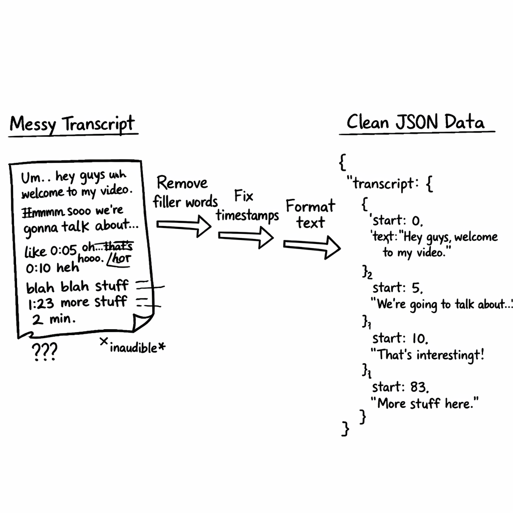 Raw transcripts are messy. They have timestamps, filler words, and repeated phrases. Cleaning makes search fast and answers accurate.